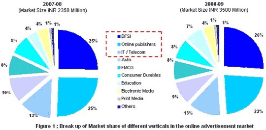 The study also revealed that BFSI, online industry and ITES with 25 per cent, 25 per cent and 13 per cent share are the leading advertisers in the online banner space in 2007/08. In 2008-09, the share of BFSI is expected to rise marginally to 26 per cent while the share of online companies is likely to come down to 23 per cent. Auto, FMCG, consumer durables and dducation are some of the leading sectoral advertisers in the online banner space.