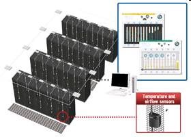 The system incorporates an environment-monitoring sensor network featuring compact, energy-efficient temperature and airflow sensors, developed by Fujitsu Laboratories Limited, in combination with Fujitsu's proprietary wired ad-hoc networking technology. This makes possible a self-configuring network that requires no special design or configuration, which keeps both deployment and operating costs low while allowing for large-scale, fine-grained environmental sensing with tens of thousands of sensors.