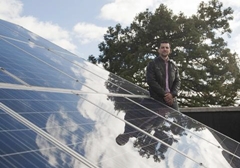 | Researcher Oscar Barambones behind some solar panels at the University of the Basque Country / Image credit: Nuria González (UPV/EHU) |