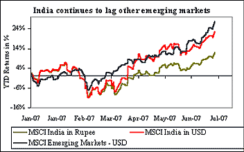 For the year, MSCI India index has returned 22.65 per cent in dollars as against 27.48 per cent returned by MSCI Emerging Markets Index. Returns in rupees at 12 per cent remains substantially lower than US dollar returns, as the currency has appreciated this year.