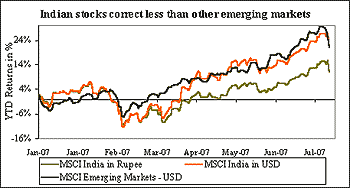 But, Indian markets had less of a fall than others this week. Better than expected quarterly numbers from some of the large-cap Indian companies helped limit the fall. MSCI India index lost 2.97 per cent for the week while the MSCI Emerging Markets index lost a massive 5.6 per cent in US dollars. To put this week's decline in perspective, the MSCI India index had returned nearly 21 per cent in dollars during the April-June period.