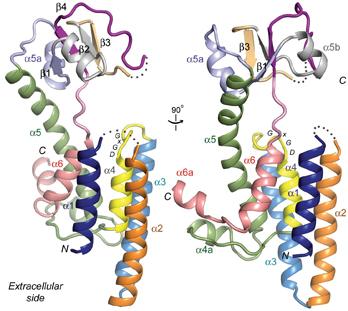 | Side views of the structure of a Flak protein, a member of the same family of proteins that include presenilin, which is implicated in the onset of Alzheimer's. Understanding the structure of these proteins is an early step in the development of drugs that can combat dementia. |