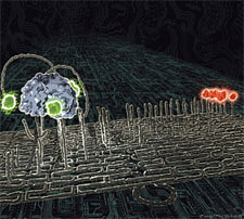 | The latest installment in DNA nanotechnology has arrived: A molecular nanorobot dubbed a "spider" and labeled with green dyes traverses a substrate track built upon a DNA origami scaffold. It journeys towards its red-labeled goal by cleaving the visited substrates, thus exhibiting the characteristics of an autonomously moving, behavior-based robot at the molecular scale. [Credit: Courtesy of Paul Michelotti] |