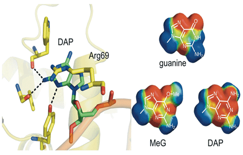 CAPTION: The figure shows a zoomed in structure (derived by X-ray crystallography) of a complex between Atl1 and DNA containing 2,6-diaminopurine, an analogue that has the same electrostatic charge characteristics as O6-alkylguanine