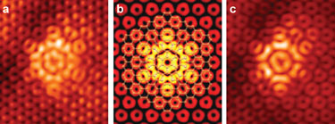 | Flower-like defects in graphene can occur during the fabrication process. The NIST team captured images of one of the defects (figures a and c) using a scanning tunneling microscope. A simulated image from their computer models (figure b) shows excellent agreement. Credit: Cockayne,Stroscio/NIST. |