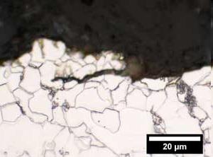 | Micrograph of crack in X52 steel after the sample was subjected to mechanical forces for several days in an ethanol solution containing acid-producing bacteria, Acetobacter aceti. Researchers at NIST's biofuels testing facility found that the bacteria increased fatigue crack growth rates at least 25-fold compared to what would occur in air. Credit: Sowards/NIST |