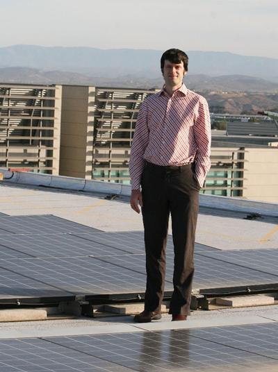 | Jan Kleissl, a professor of environmental engineering at the UC San Diego Jacobs School of Engineering, poses with the solar panels his team studied. |